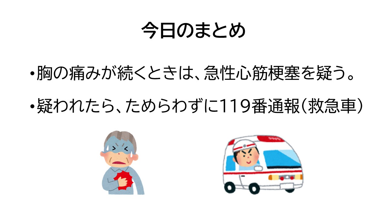 - 治療効果が高いのは急性心筋梗塞を起こしてから2時間以内であり、より効果的な治療を受けるには、すぐに救急車を呼んで早く病院に行く必要がある。