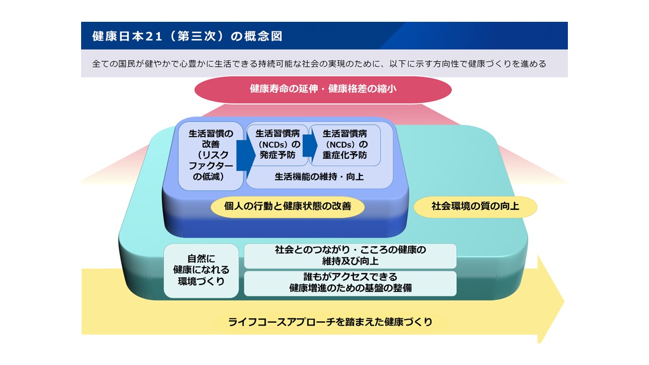 公衆衛生における一次予防(臨床では0次予防)は、健康増進法の第七条の次のような定めに則ったものです。"厚生労働大臣は、国民の健康の増進の総合的な推進を図るための基本的な方針(以下「基本方針」という)を定めるものとする。"この「基本方針」こそ、現在の「健康日本21」に相当します。「健康日本21」では、国だけでなく都道府県も住民の健康増進計画を定める義務があり、市町村は定める努力義務があるという立て付けになっています。現行の「健康日本21」は第三次であり(2024年開始)、その概念図が示されています(図1)。一番下に「ライフコースアプローチを踏まえた健康づくり」という時間軸が置かれています。そのすぐ上にあるのが環境要因であり、社会環境の質が向上しないと疾患の予防に繋がらないことが示されています。さらにその上には「個人の行動と健康状態の改善」があり、ここには普段我々が実行している「生活習慣の改善」「生活習慣病の発症予防」「生活習慣病の重症化予防」などが記載されています。これらのことを通して、一番上にある「健康寿命の延伸、健康格差の縮小」に繋げるというモデルになっています。