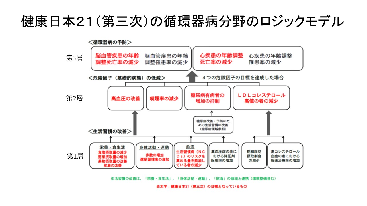 続いて「健康日本21」(第三次)の循環器病のロジックモデルを紹介します。同モデルは下から上へと順に第1層・第2層・第3層と分かれており、第1層が生活習慣の改善、第2層が危険因子(基礎的病態)の低減、第3層が循環器病の予防、となっています(図2)。第1層が改善されると第2層も改善され、最終的には第3層も改善される(脳血管疾患と心疾患の年齢調整罹患率と年齢調整死亡率の減少)という構造になっています。図2 「健康日本21」(第三次)の循環器病のロジックモデル