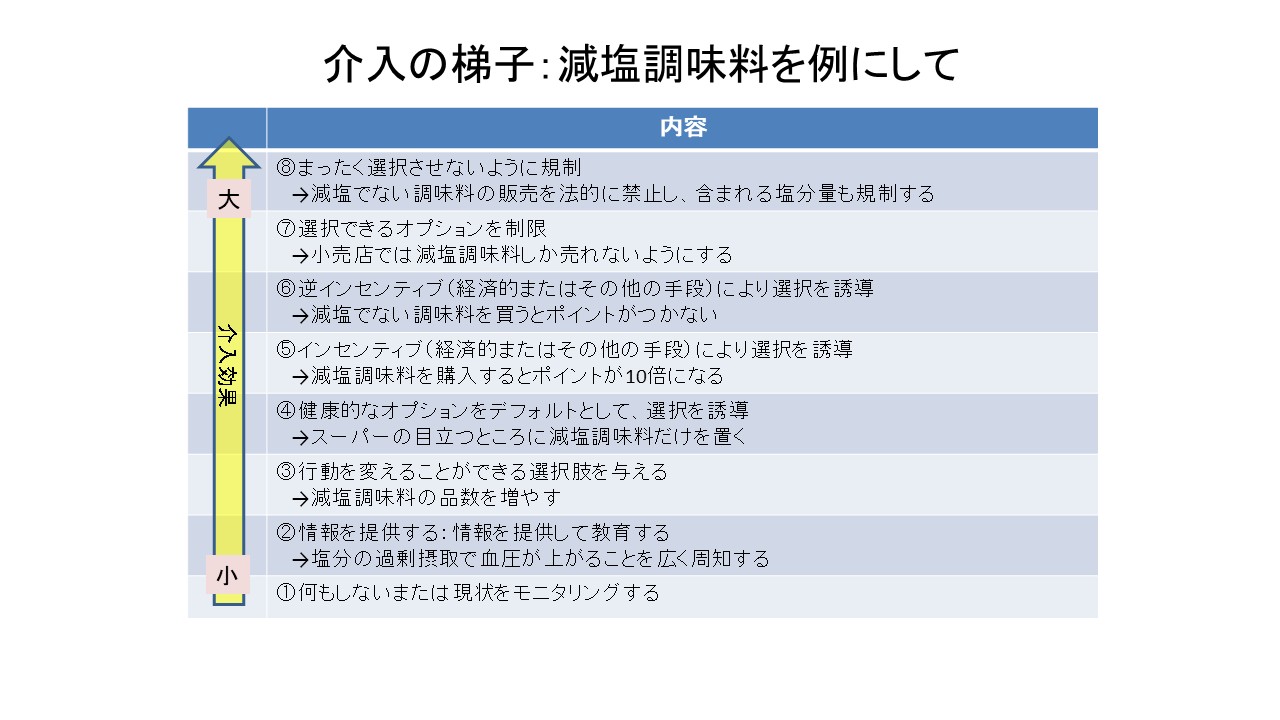 一方、ポピュレーション・アプローチは「介入の梯子」で考えます。減塩調味料を例にとると介入効果が小から大まで8段階が考えられます(図4)。減塩調味料の場合だと、⑦や⑧はナンセンスと思えますが、実は違法薬物の場合は⑧のように「まったく選択させないように規制」という対策が取られています。「介入の梯子」は、どこまで世の中が受け入れてくれるかということにも重要になります。